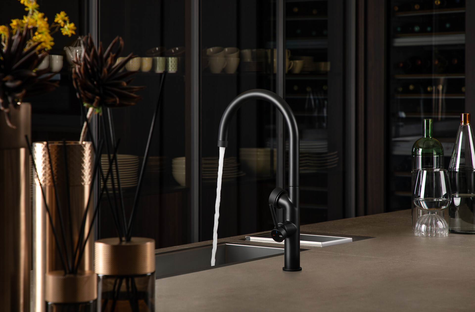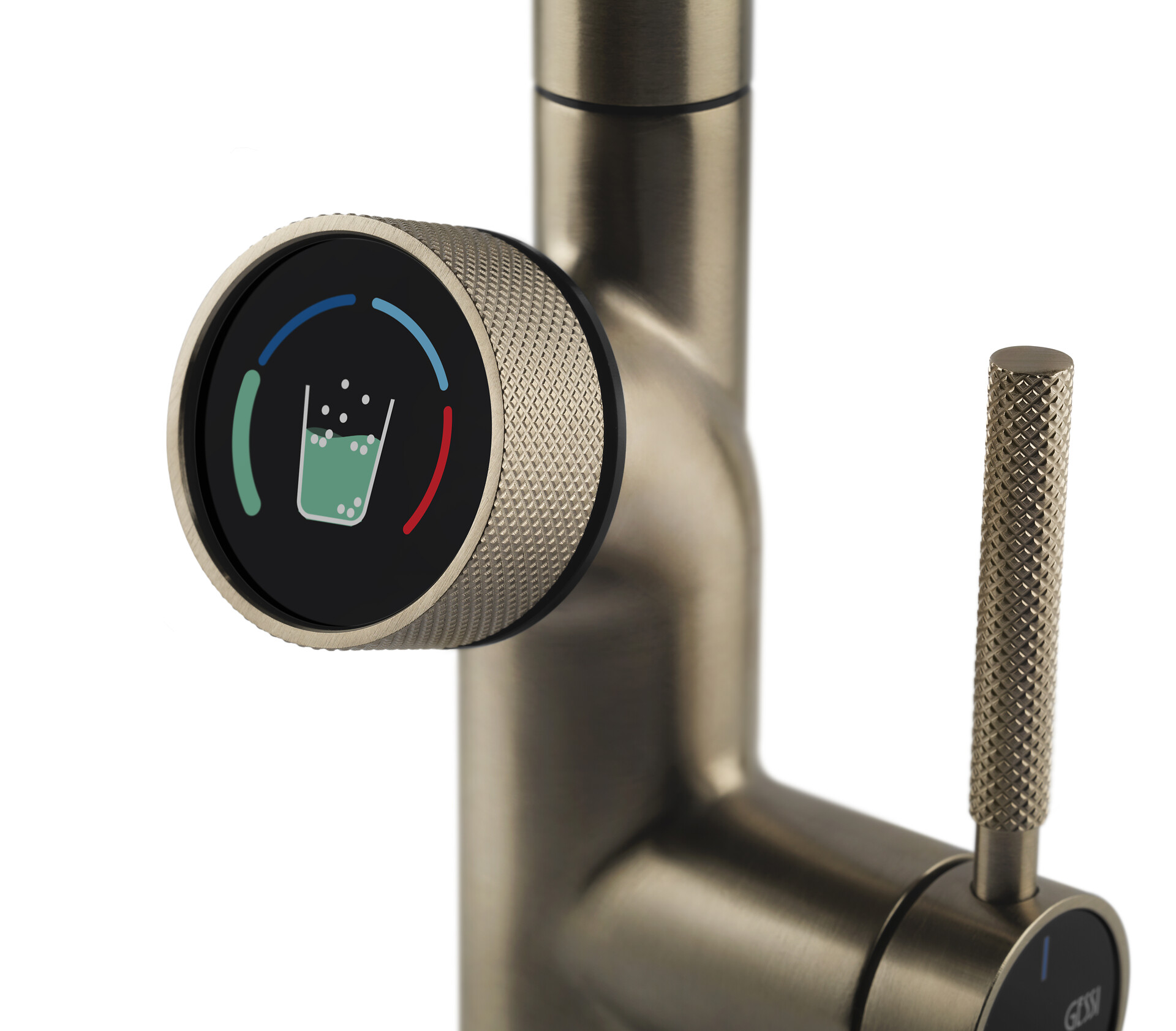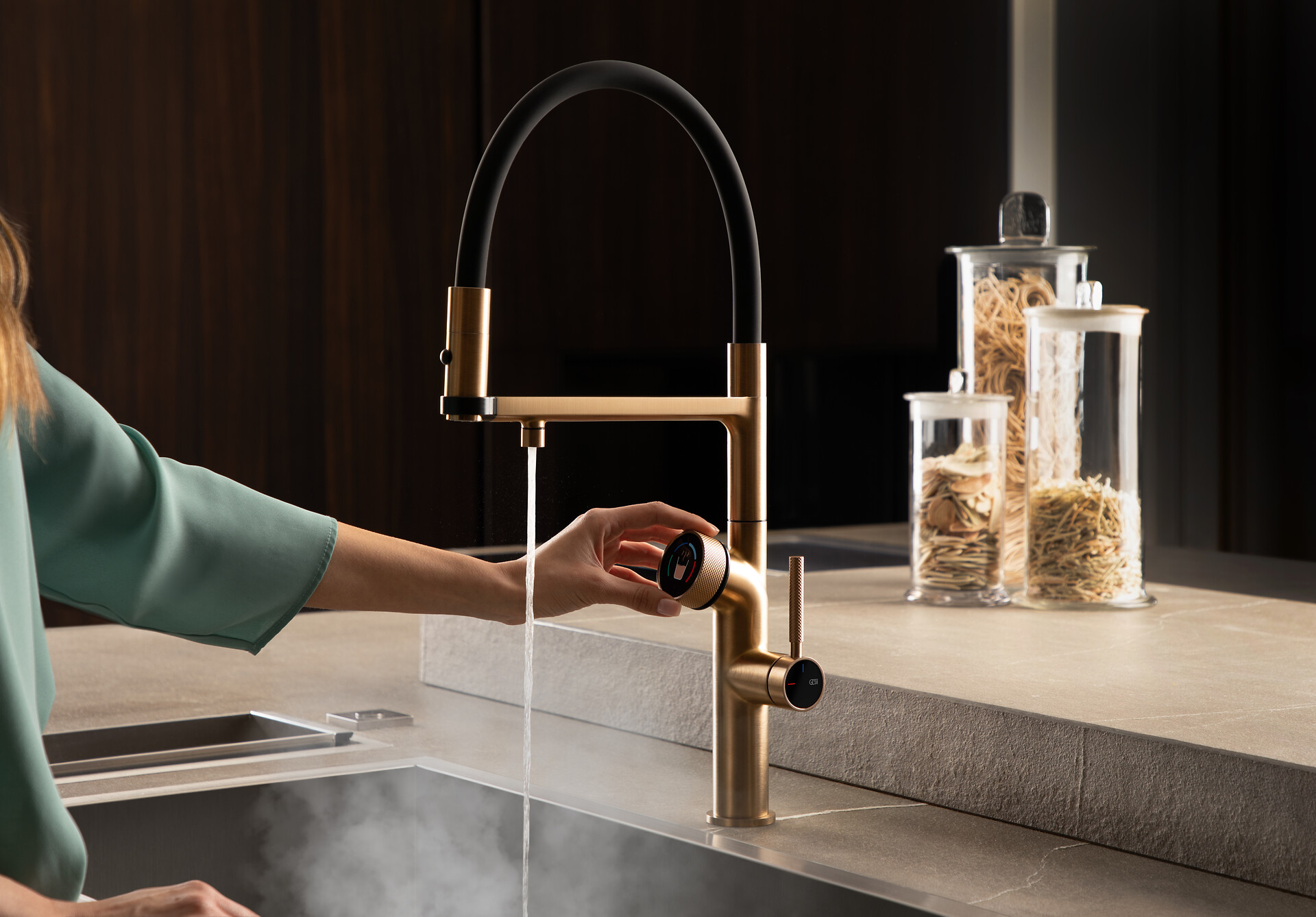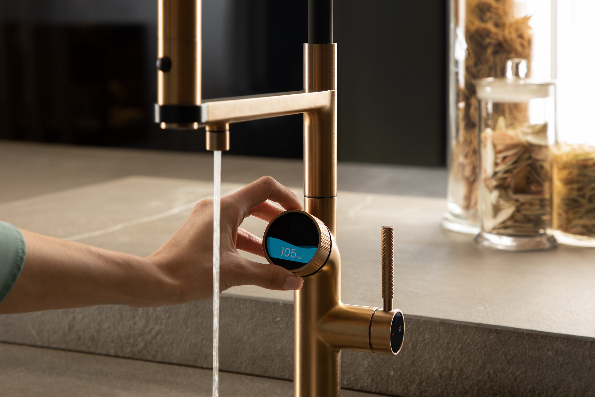 Mit digitalen Funktionselementen, die bündig montiert sind, bietet das, was als “das Haushaltsgerät” bezeichnet wird, die Möglichkeit, bis zu vierundzwanzig Kombinationen aus Wassertyp, Temperatur und Menge zu speichern – drei für jeden Typ von kaltem, warmem und sprudelndem Wasser von Teetasse bis Babyflasche bis Trinkflasche.
